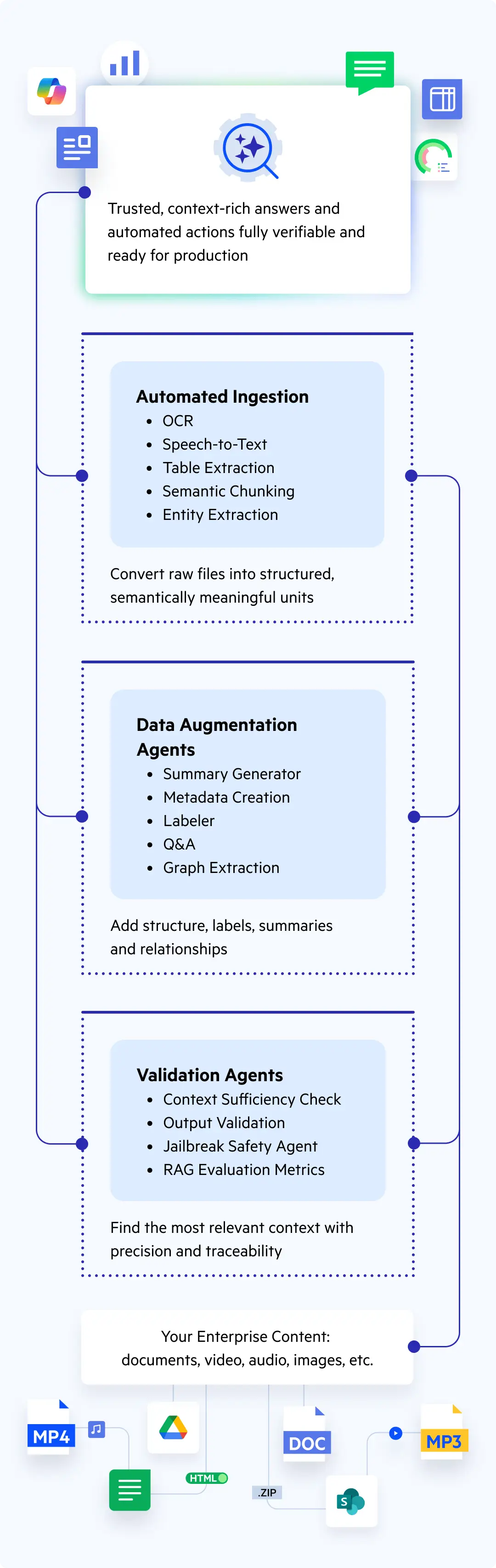 From data ingestion to validation, the AI agents embedded within the Progress® Agentic RAG solution elicit responses that are accurate, explainable and aligned with your organization’s real-world context.