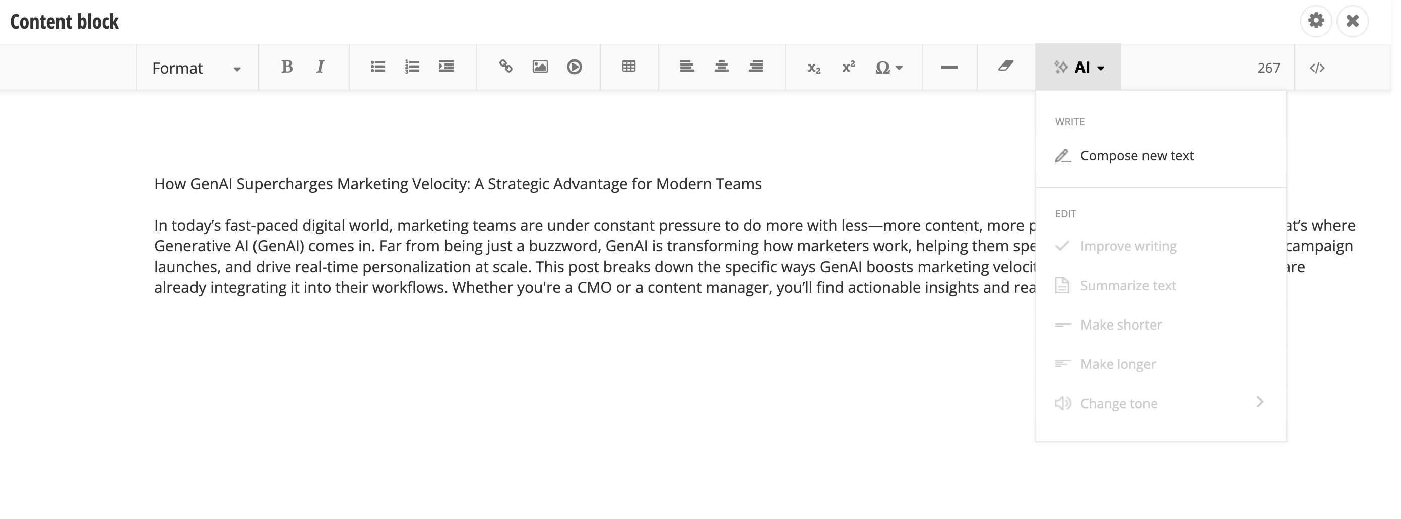 Examples of tasks include using GenAI to create content such as blog posts and SEO keywords, summarize, optimize and create personalized content, or auto-tag content.